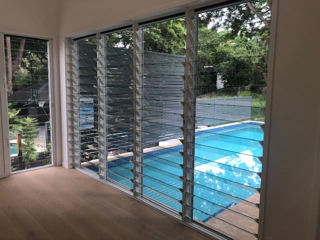 Downstairs, the living and kitchen area opens completely to the outdoors through large glass doors. High ceilings and expansive windows let natural light flood in during winter while keeping things cool in summer. The butler’s pantry tucks behind the kitchen, accessible but out of sight.