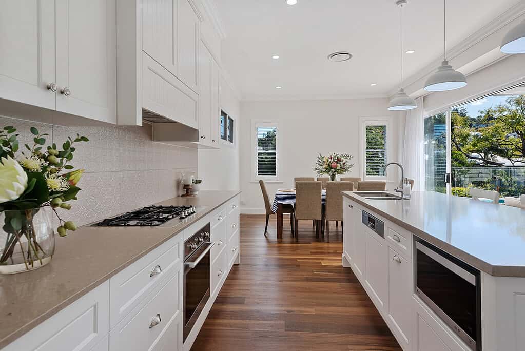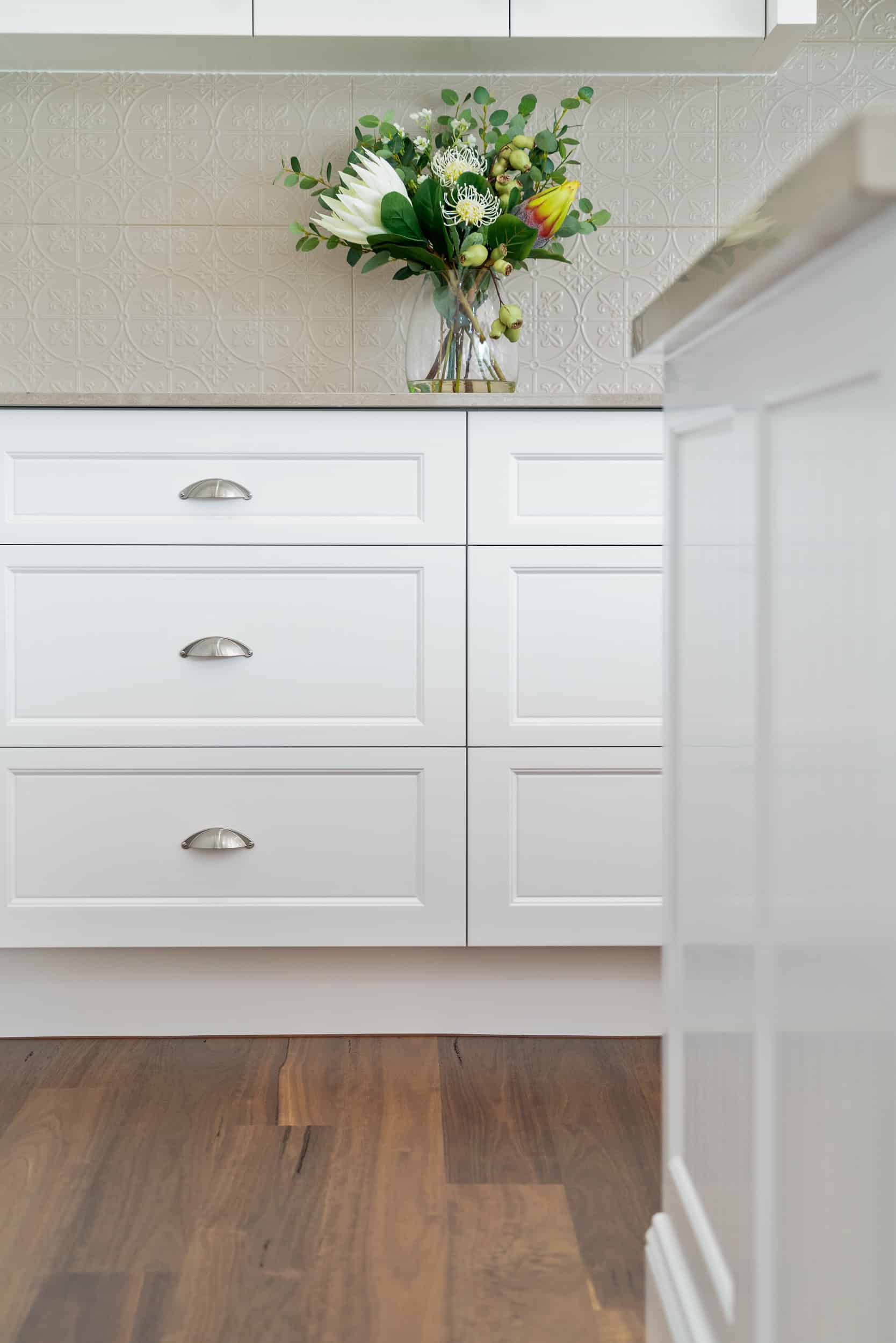 The new kitchen strikes the perfect balance. White shaker cabinets nod to traditional joinery while white tiled splashbacks add period detail. Spotted gum timber floors warm the space, and grey pendant lights provide a contemporary touch without overwhelming the classic palette.