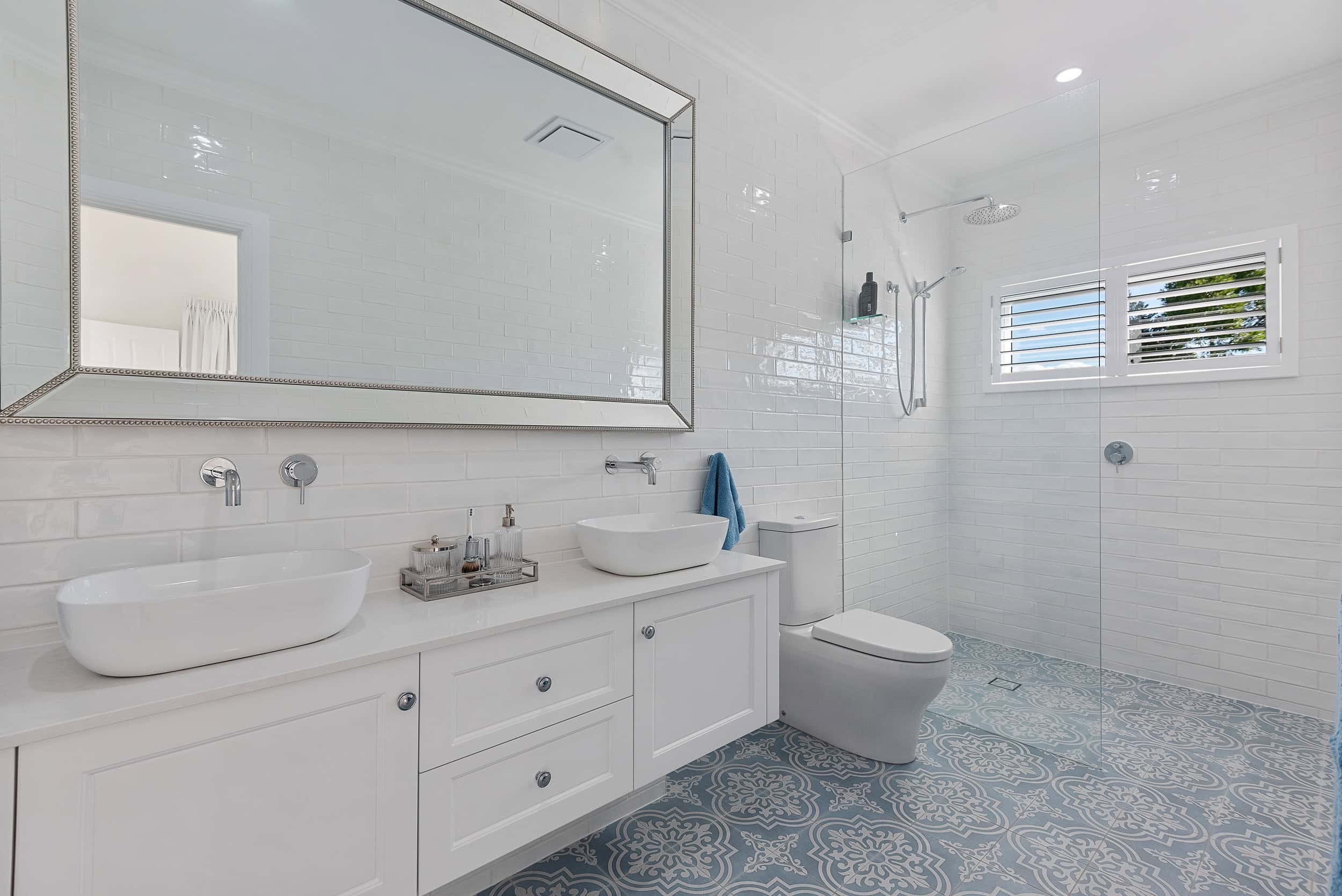 The bathrooms received a complete transformation. Patterned floor tiles add personality while subway tiles keep things classic. Twin basins, frameless showers, and quality fixtures deliver the luxury expected in a modern renovation.